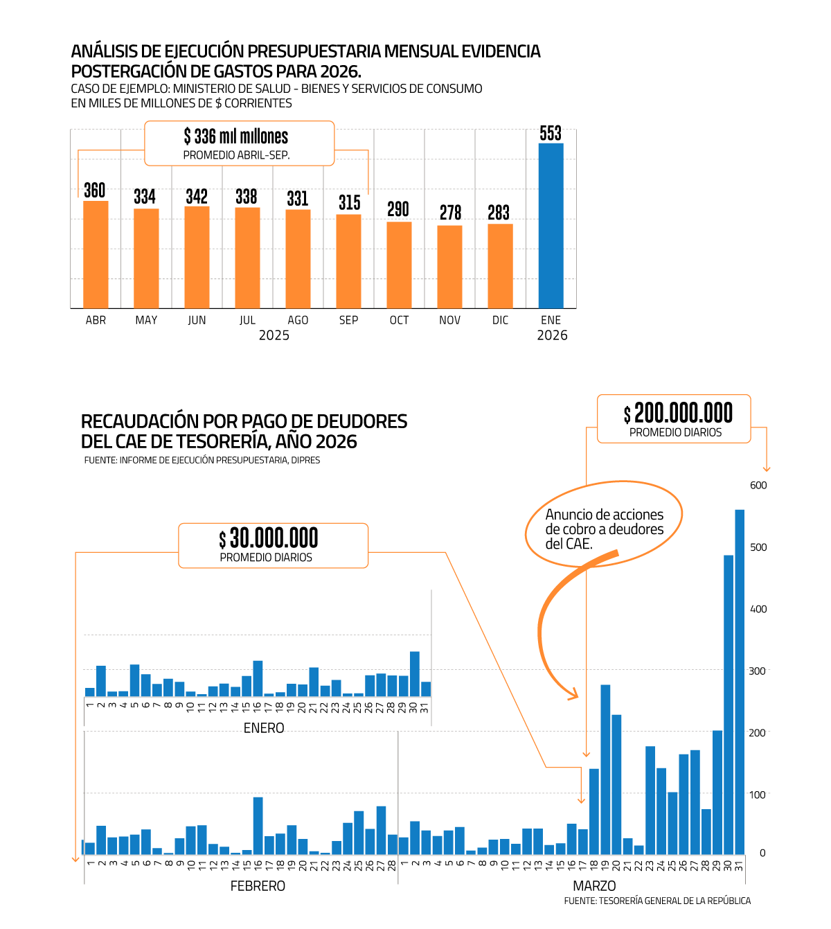 Asimismo, denunció que la ejecución presupuestaria de enero en el Ministerio de Salud evidenció presiones de gasto que muestran que se postergaron pagos desde el año pasado al actual por un total de más de US$ 170 millones: en concreto, expuso que en el cuarto trimestre de 2025 el gasto se contrajo un 15% en comparación al nivel normal, pero que en enero se expandió un 65% respecto de su nivel de equilibrio y prácticamente duplicó los desembolsos de diciembre.