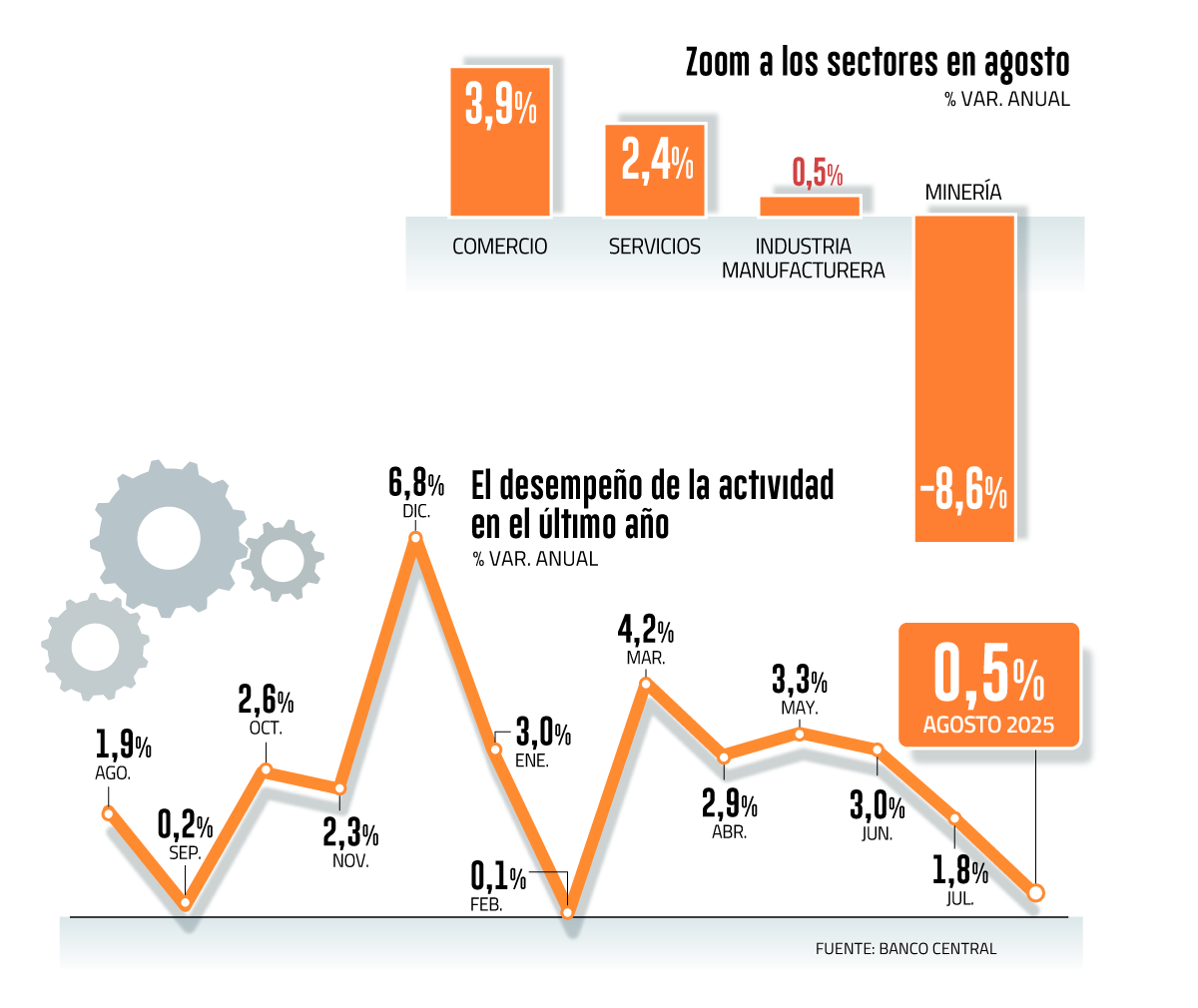 Su peor registro desde febrero y, por debajo de las expectativas del mercado, se ubicó el Índice Mensual de Actividad Económica (Imacec) al crecer solo 0,5% anual en agosto, comparado con igual mes de 2024, según informó el Banco Central.