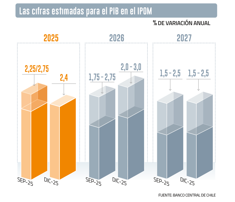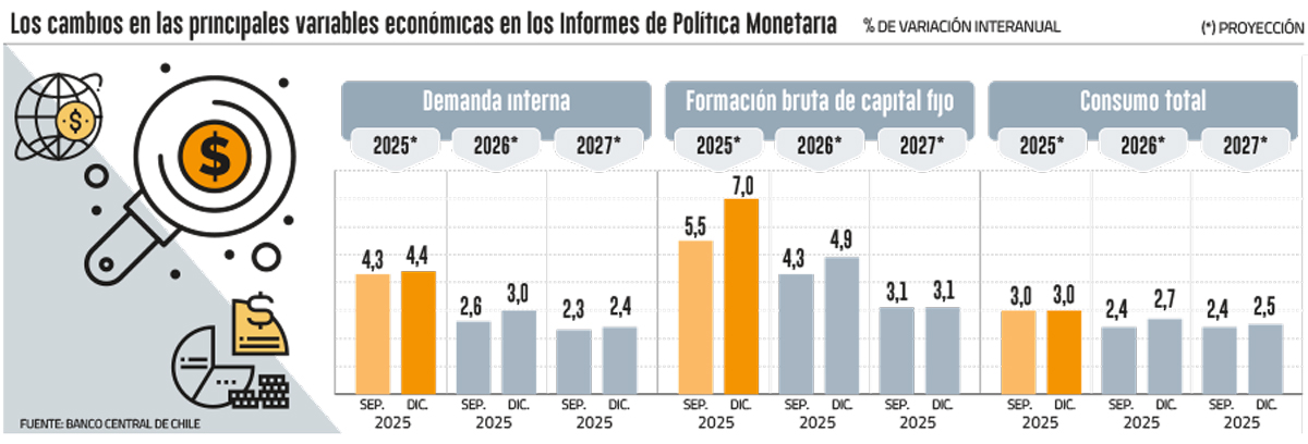 Así se desprendió del Informe de Política Monetaria (IPoM) correspondiente a diciembre que presentó este miércoles el Consejo del Banco Central ante la comisión de Hacienda del Senado, el que incluyó un alza en las expectativas de crecimiento para 2026, en medio de una clara recuperación de la inversión en el país y la esperada moderación de los precios internos.