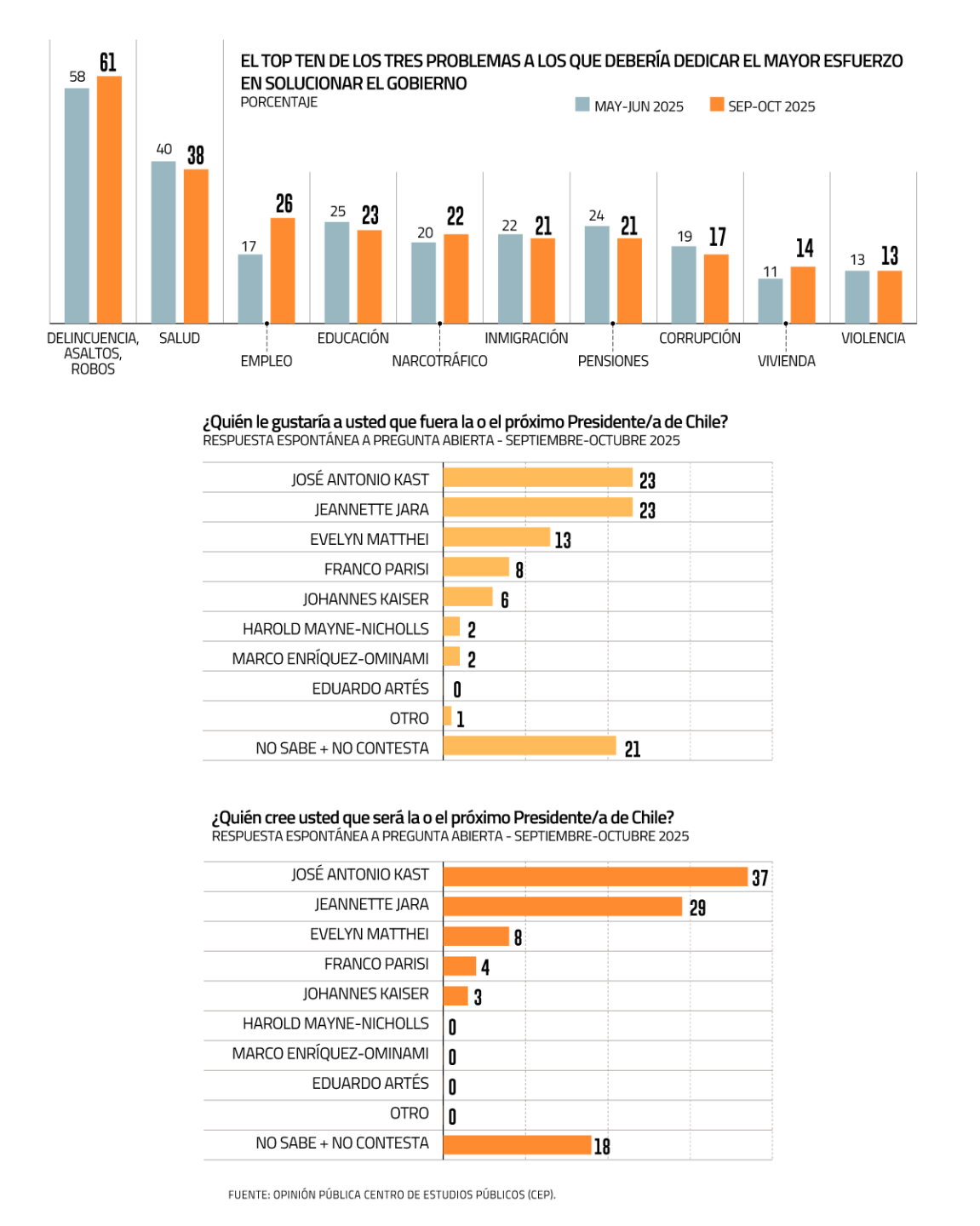 Según la CEP, las tres principales áreas donde el próximo Gobierno enfrentará desafíos y a las que debiera dedicar su mayor esfuerzo son “delincuencia, asaltos, robos” (61%), que desde la medición de junio pasado subió nueve puntos. Mucho más atrás completan el podio salud (38%) y empleo (26%)