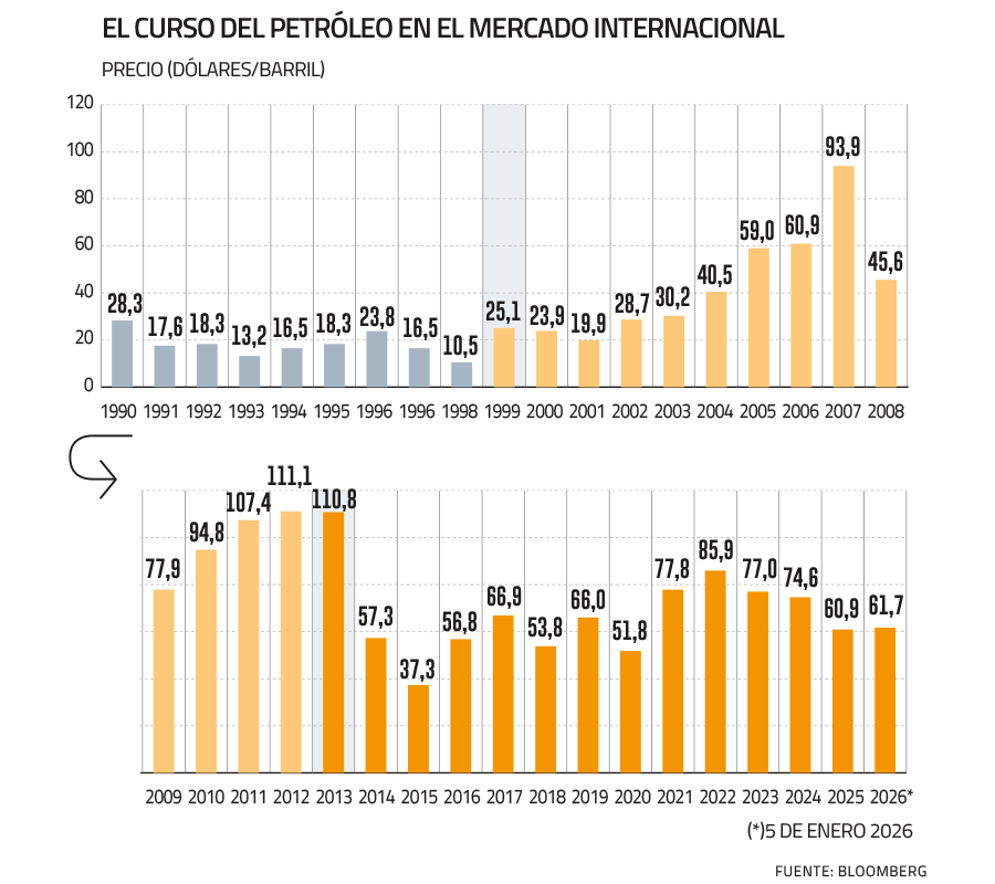 En estos momentos, se estima que la producción es de 1 mbpd, con un precio de US$ 61,7 por barril. Una cifra que dista del máximo al que llegó en 2012 con US$ 111, mientras que en 1999 fue de US$ 25,1.