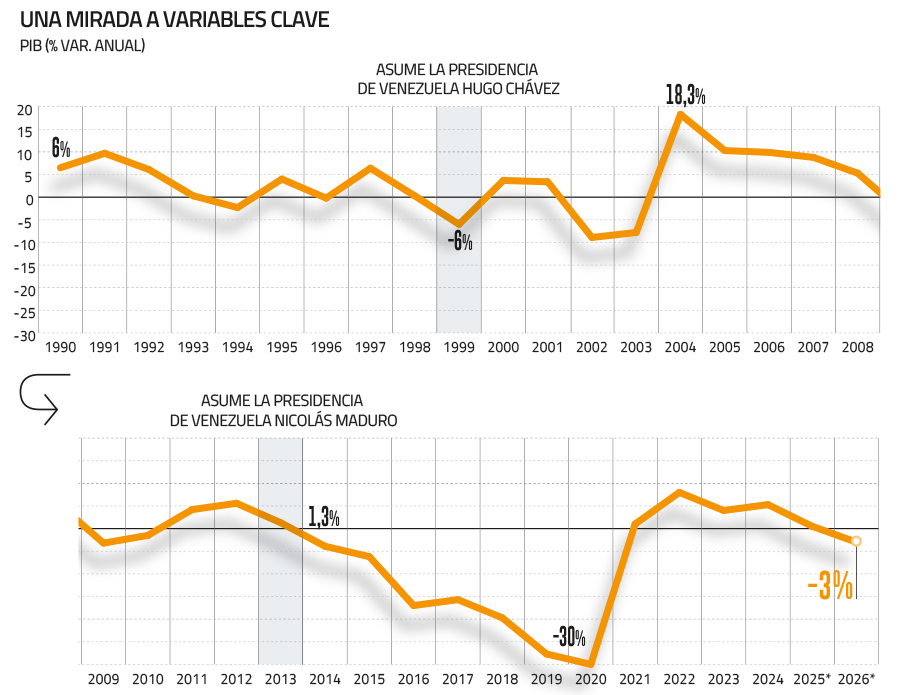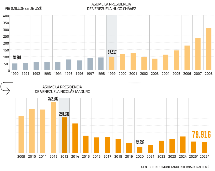Para 2025 se estima que el tamaño de la economía alcanzó unos US$ 82.767 millones, según el FMI. Su peak, durante la administración de Hugo Chávez, bordeó los US$ 400 mil millones.