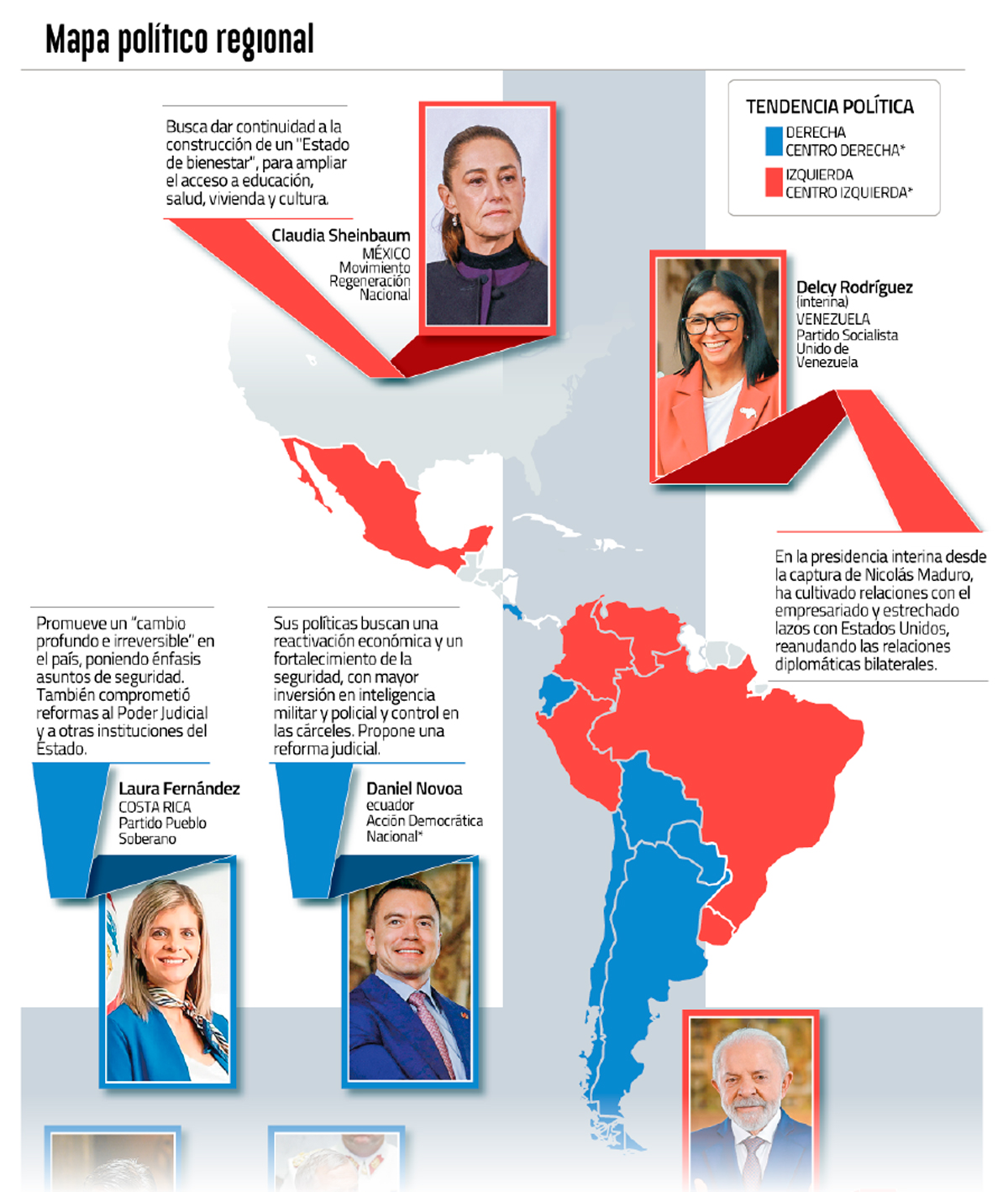 Sin embargo, la izquierda se impone en los dos mayores países de la región: Luiz Inácio Lula da Silva en Brasil y Claudia Sheinbaum en México. A ellos se suman Yamandú Orsi de Uruguay y Gustavo Petro en Colombia, país que no cambiaría de signo político en sus elecciones presidenciales de mayo, donde las encuestas le dan ventaja al oficialista Iván Cepeda.