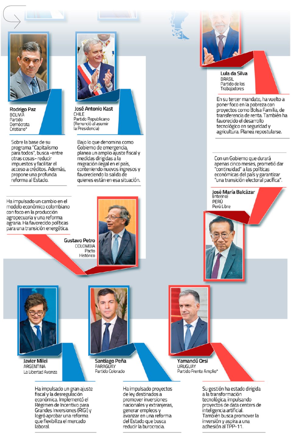 Punto aparte, merecen las presidencias interinas en Perú y Venezuela. Mientras en el país andino recién asumió el izquierdista José María Balcázar, quien permanecerá solo cuatro meses en el poder, en Caracas gobierna la chavista Delcy Rodríguez, tras la captura de Nicolás Maduro.