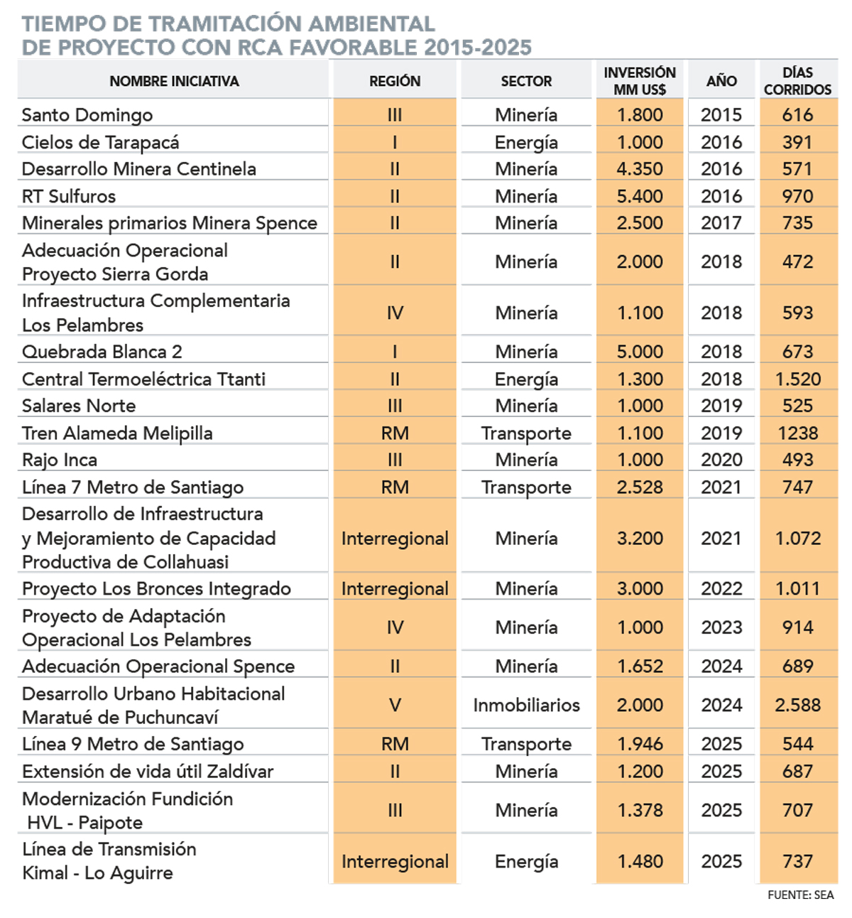 En estas obras de calificación más rápida destacan varios proyectos mineros, como la modernización de la Fundición Paipote de Enami, que se despachó en 707 días; la extensión de la vida útil de Zaldívar, del grupo Luksic, que se aprobó en 687 jornadas o Rajo Inca de Codelco, que se evaluó en 493 días.