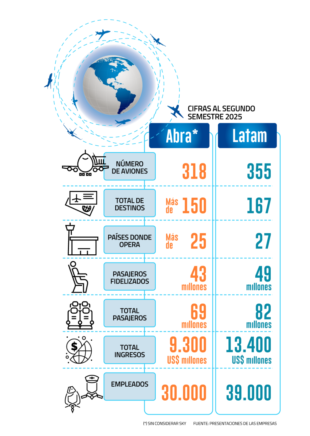 Una presentación a inversionistas de Abra de septiembre de este año revela que, por ejemplo, en términos de aviones, la multinacional tiene 318 aeronaves, que se suman a las 36 de la aerolínea chilena. Y Latam Airlines tenía al primer semestre de este año 355 aviones.