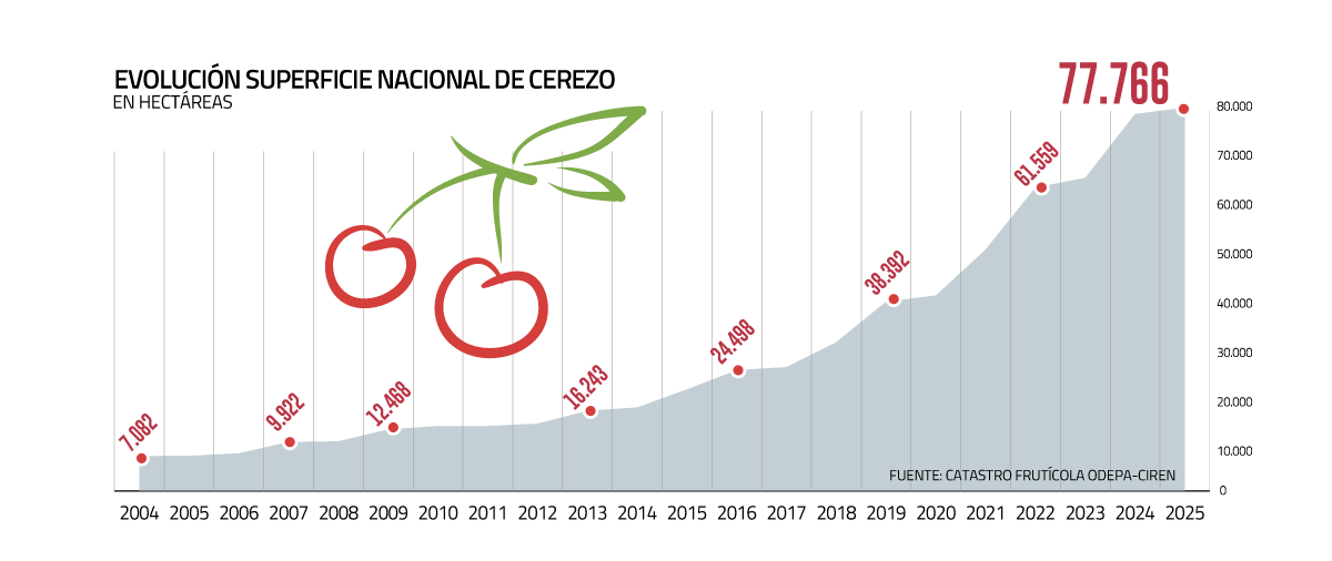 En los últimos 20 años, la cantidad de hectáreas plantadas con cerezos en Chile se disparó desde 7.082 en 2004 hasta casi 80.000 en 2025, según Odepa. El boom se registró sobre todo en los últimos cinco años, cuando los niveles se duplicaron tras las exitosas campañas de venta en Asia por el Año Nuevo Chino, donde el exclusivo fruto rojo simboliza buena suerte y prosperidad. Y así, en el último quinquenio, Chile pasó de exportar 70 millones de cajas a 125 millones.