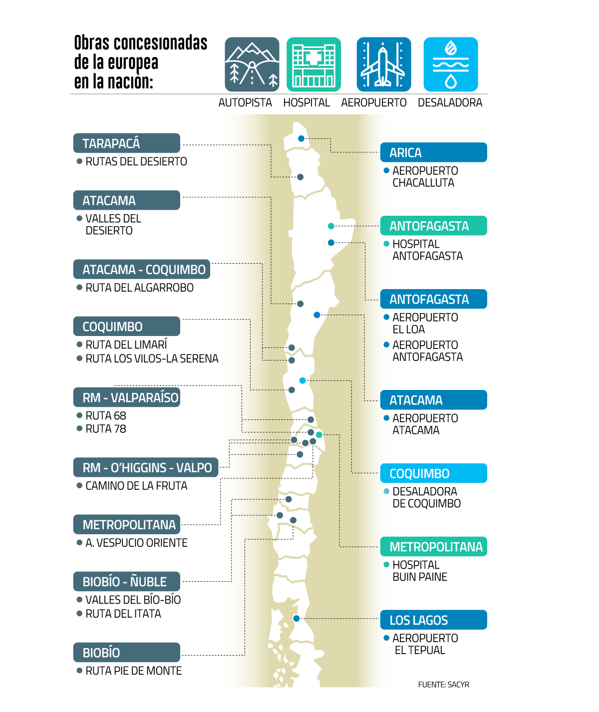 Actualmente, Sacyr mantiene una cartera de 20 concesiones activas, que abarca proyectos como hospitales y autopistas (ver infografía), invirtiendo más de US$ 6.500 millones en la industria local.