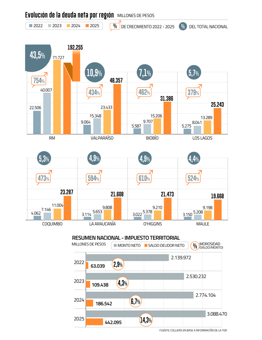 “No obstante, la práctica muestra un fenómeno distinto: comunas tradicionalmente cumplidoras han transitado hacia niveles de morosidad históricamente altos. A nivel nacional, el saldo deudor neto pasó de $ 63.000 millones en 2022 a los $ 442.100 millones en 2025, lo que representa un incremento del 601%”, señala la experta.
