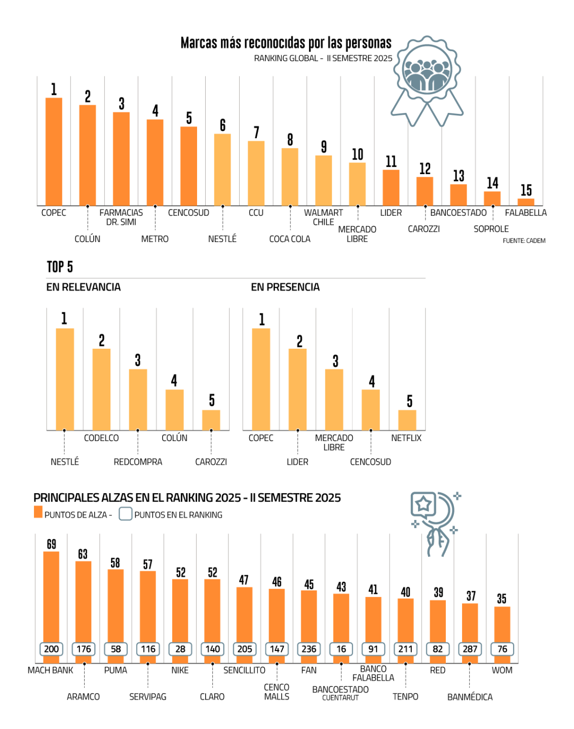 Según Cadem, “esto también permite ver cómo están posicionadas las marcas en otro segmento, qué marcas coinciden con la opinión pública, cuáles entran y cuáles no se consideran, además de identificar a líderes y empresarios que sean reconocidos por impulsar marcas ciudadanas”.
