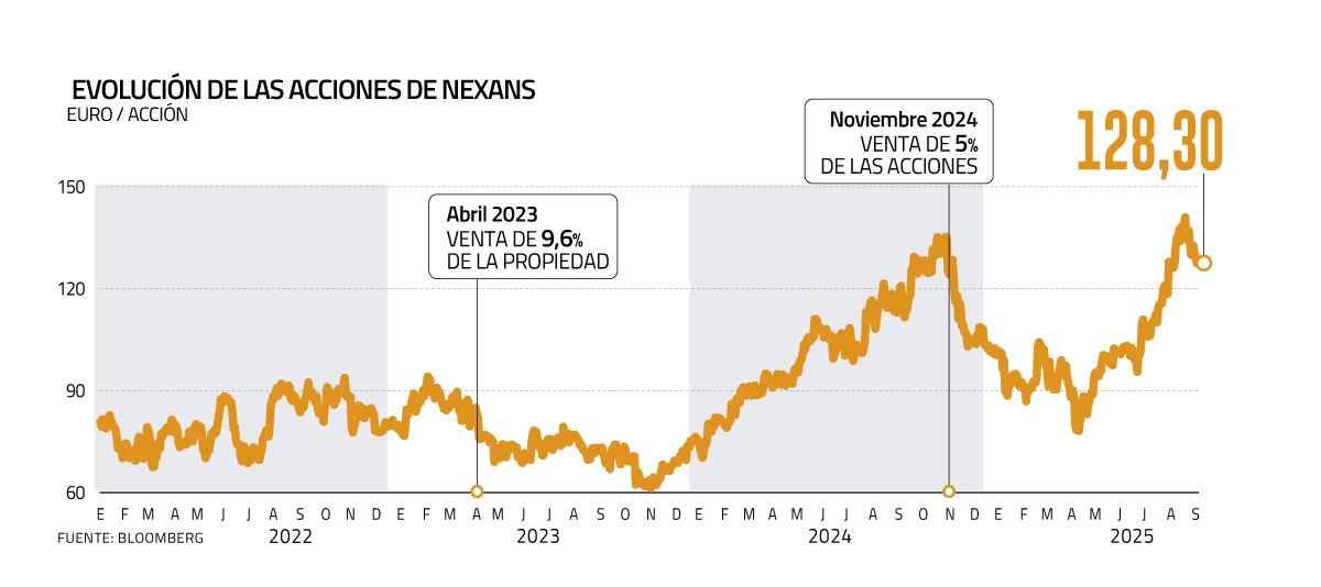 La cotización actual de los títulos de Nexans es de 128,3 euros, con lo cual la operación involucraría 282,26 millones de euros, equivalentes a unos US$329,7 millones. Esta sería la tercera venta de acciones de la compañía europea que realiza el grupo Luksic en menos de tres años, la que -dependiendo de las condiciones- podría allegar recursos por unos US$ 800 millones al conglomerado.