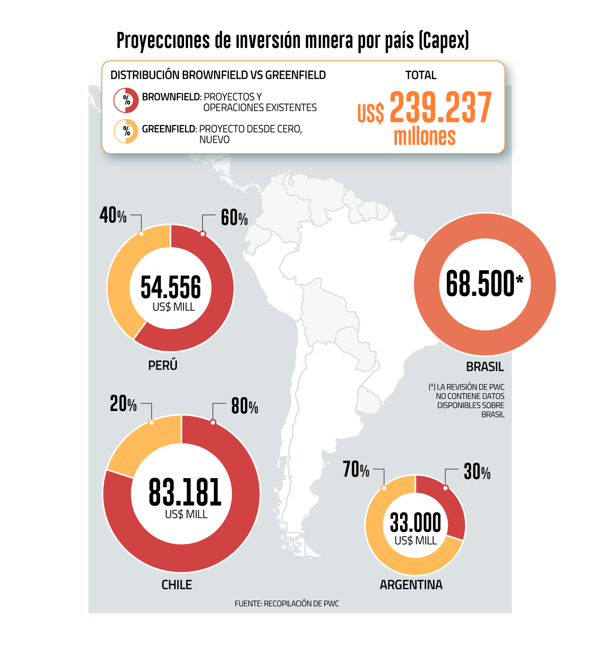 “Los casos de Chile y Perú son ilustrativos de entornos maduros, donde predomina el desarrollo de activos existentes”, indican los expertos, donde estiman que el 80% y 60% de la inversión, respectivamente, se destinará a proyectos brownfield. “Este tipo de iniciativas se enfocan en la aplicación, modernización o reaprovechamiento de faenas ya operativas, y tienden a presentar menores riesgos regulatorios, tiempos más acotados para la obtención de permisos y una mayor capacidad de apalancamiento operativo”, agregan, y marcan que la infraestructura de estos países, su institucionalidad y capital humano “favorecen la reinversión”.