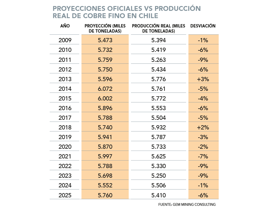 Desde 2009, en algunos periodos críticos las diferencias se ubicaron entre 7% y 9% -ver tabla- , mientras que en 2025 la brecha fue de 6%, en un contexto en que cualquier variación en el principal productor de cobre del mundo impacta el equilibrio del mercado.