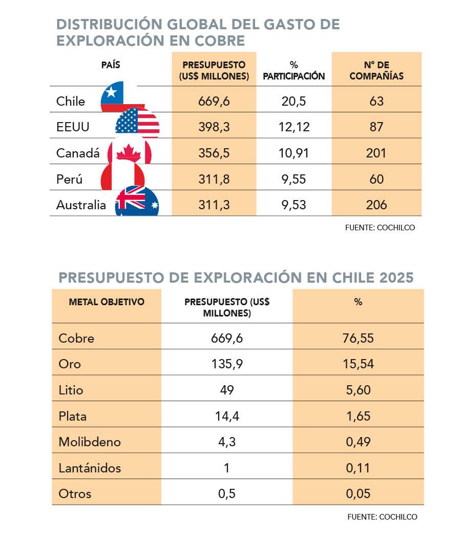 De hecho, la cifra no solo posiciona al cobre como líder a nivel local, sino que también a Chile como el principal destino del mundo en el presupuesto de exploración del metal rojo, representando el 20,5% del total, con 63 compañías exploradoras (ver tabla).