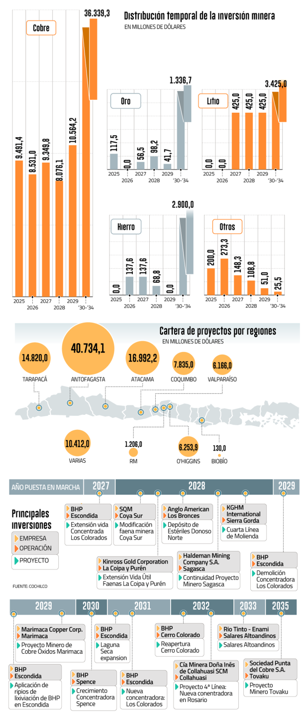 Por regiones, Antofagasta se consolida como el principal eje minero de Chile, concentrando inversiones por US$ 40.734 millones, impulsadas por grandes proyectos de expansión, continuidad operacional y reposición.