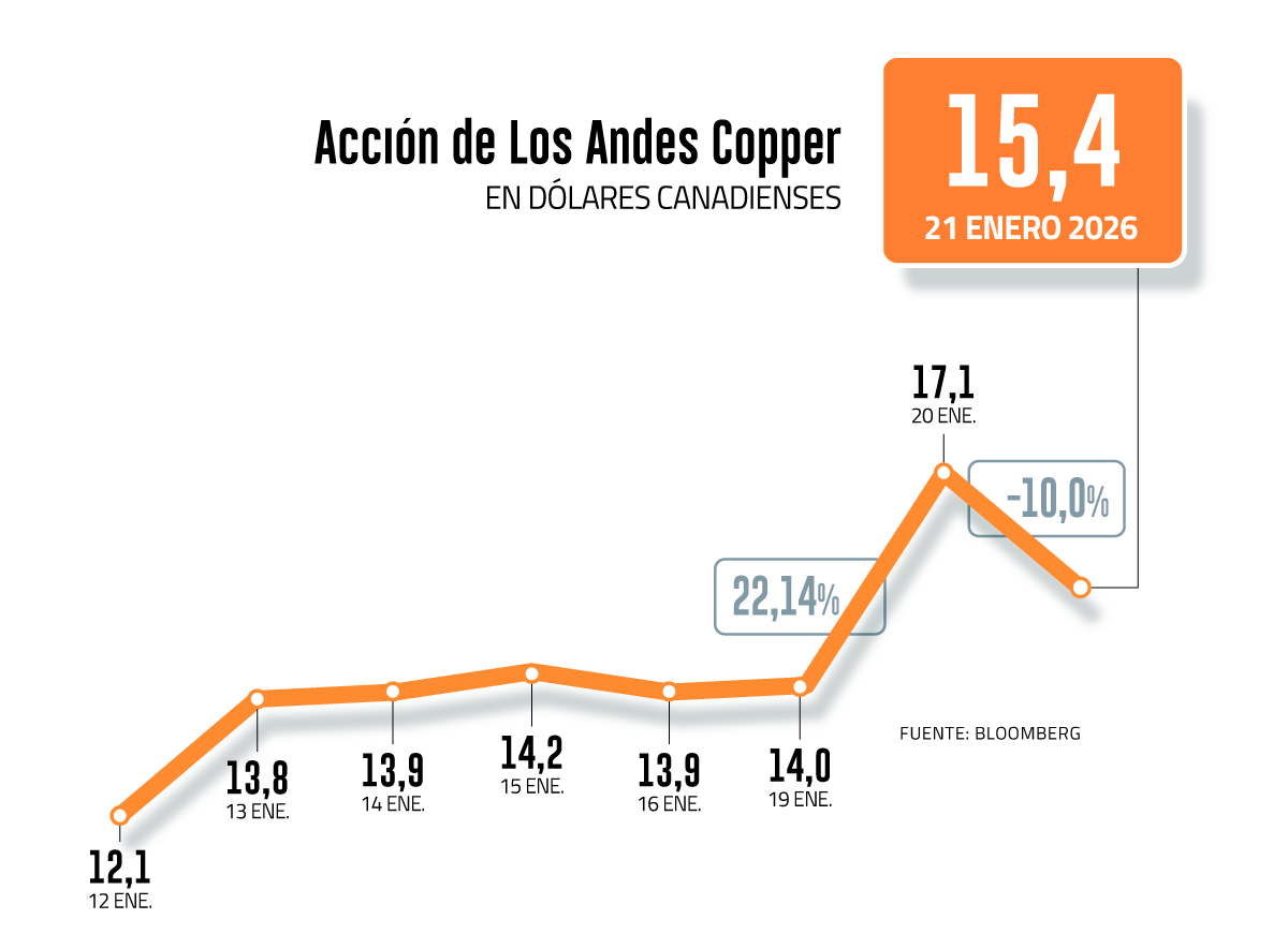 El texto difundido por Los Andes Copper vio la luz unas tres horas antes del cierre de la Bolsa de Toronto. Así, tras la notificación de la noticia al mercado canadiense, las acciones de la minera saltaron 22,14% (ver gráfico). Sin embargo, luego del traspié, este miércoles los papeles se corrigieron un 10%.