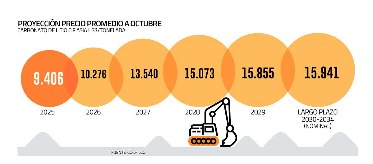 Según el reporte, en octubre el litio se movió en un escenario de “moderada volatilidad”, transándose dentro de una banda entre US$ 9.400/ton y US$ 9.600/ton en los contratos de largo plazo, tanto en Asia como en Sudamérica. Pese a este comportamiento estable, el precio del concentrado de espodumeno “experimentó un notable incremento de casi el 11%", indica Cochilco.