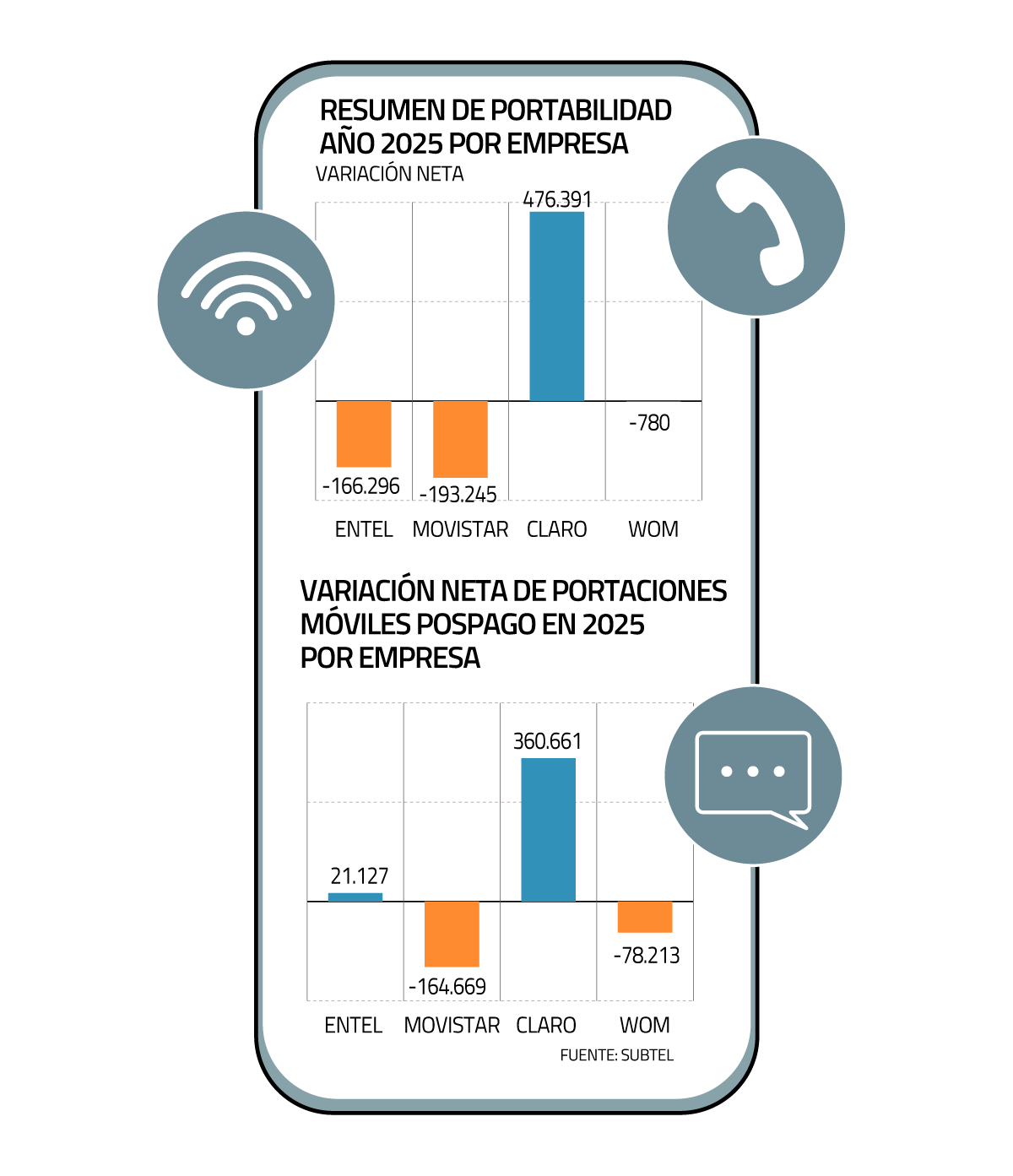Asimismo, en el resumen histórico de portabilidad por empresa al 31 de diciembre de 2025, WOM lidera el saldo neto acumulado con 3.501.571 líneas, seguida por Claro con 1.276.187, mientras Movistar (-1.082.950) y Entel (-4.806.453) mantienen saldos negativos en el total histórico.