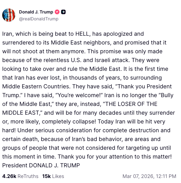 "Irán, que está siendo duramente golpeado, se ha disculpado y se ha rendido ante sus vecinos de Oriente Medio, y ha prometido que no les disparará más. Esta promesa se hizo solo debido al incesante ataque estadounidense e israelí", escribió el presidente estadounidense en su plataforma Truth Social el sábado.