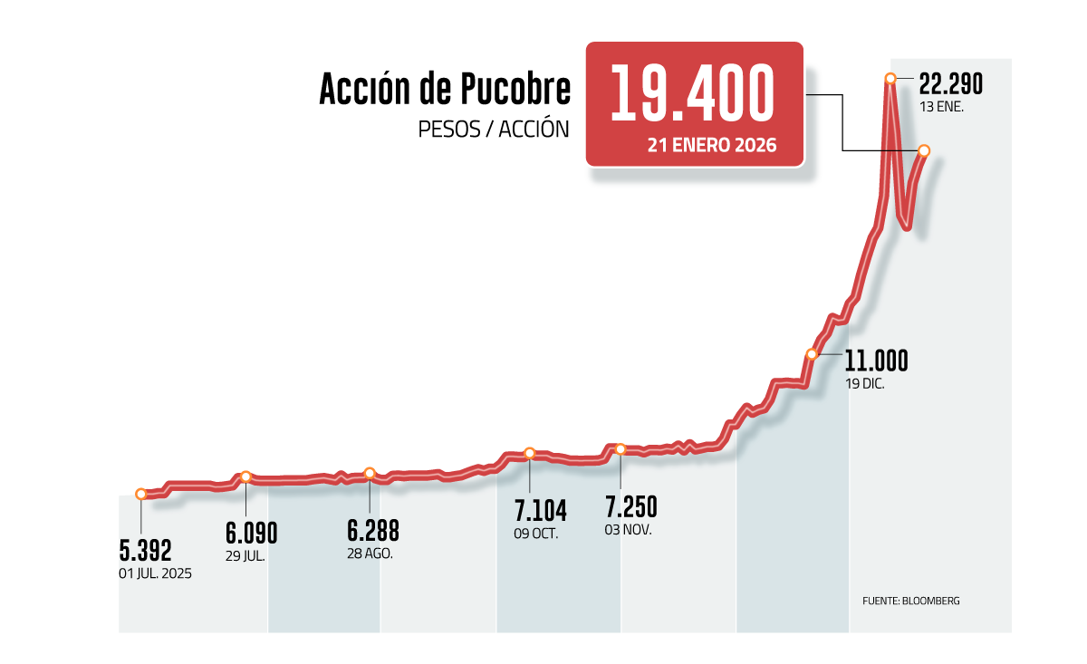Desde el cierre de 2024 hasta la actualidad, el market cap de Pucobre se ha cuadriplicado, ya que pasó de $ 590 mil millones a $ 2,42 billones (millones de millones). Y siendo normalmente una acción de muy poca liquidez, los montos transados han aumentado con fuerza: en el curso de 2026 suman casi $ 10.900 millones, superando incluso a una de las empresas del S&P IPSA.