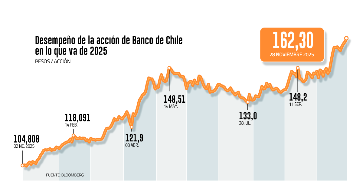 A medida que se acerca el final del año, comienza a tomar fuerza que Banco de Chile mantendrá la pole position y cerrará 2025 con la mayor capitalización bursátil.