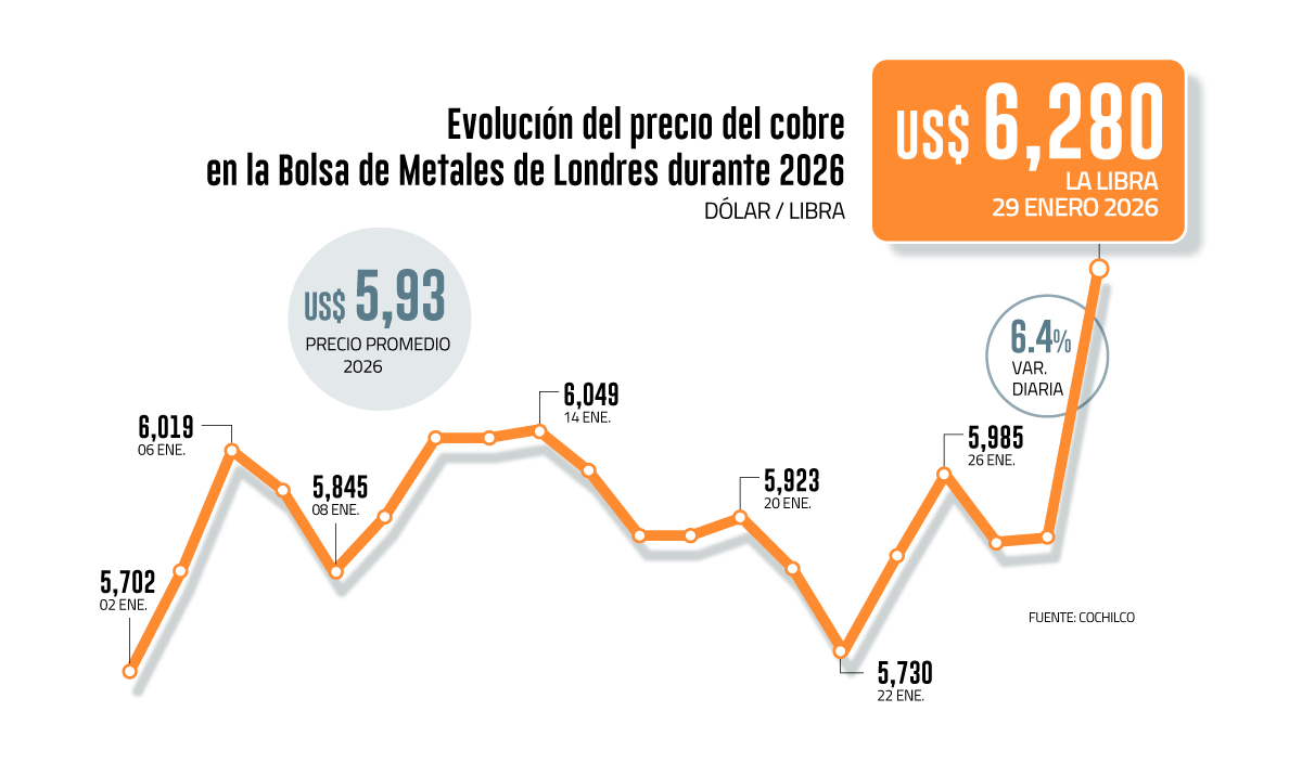 Si bien el cobre ya había anotado una serie de marcas récord a fines de 2025, el impulso del metal rojo no se detuvo. Este jueves, el cobre alcanzó un nuevo máximo histórico de US$ 6,28 la libra en la Bolsa de Metales de Londres, según Cochilco, y su valor promedio en lo que va del año ya se ubica en torno a los US$ 5,9 la libra.