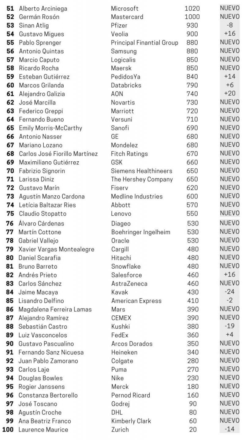 Los últimos dos puestos del Top 10 fueron ocupados por el argentino Eduardo López, CEO de Google Cloud (8), seguido por el francés Stéphane Maquaire, CEO de Carrefour, quien ingresó en esta versión al sondeo.