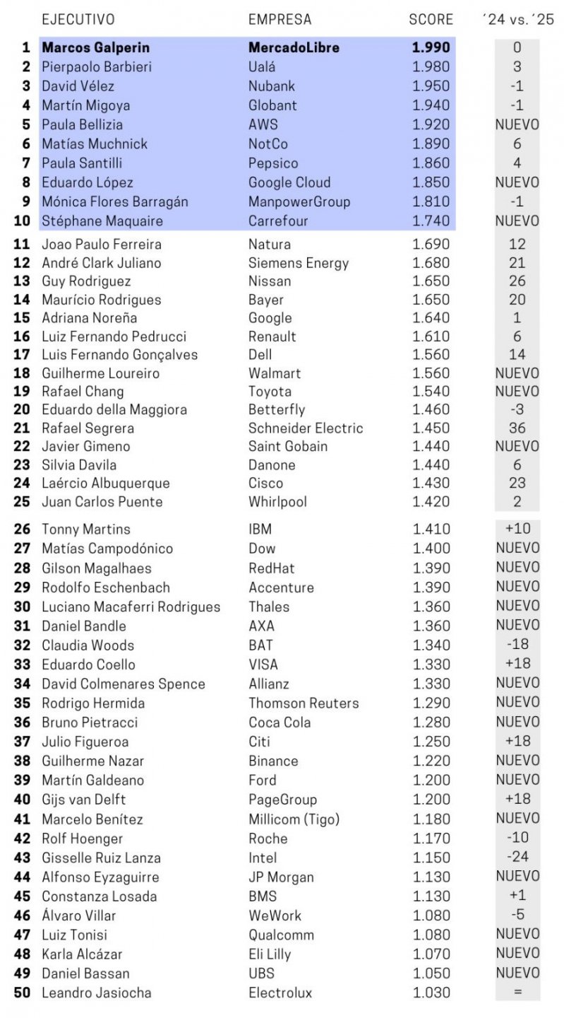 En tanto, el colombiano David Vélez, fundador y CEO del neobanco brasileño Nubank, se posicióno en el tercer puesto, lo que implicó un descendo de un peldaño ya que en 2024 se posicionó detrás de Galperin.