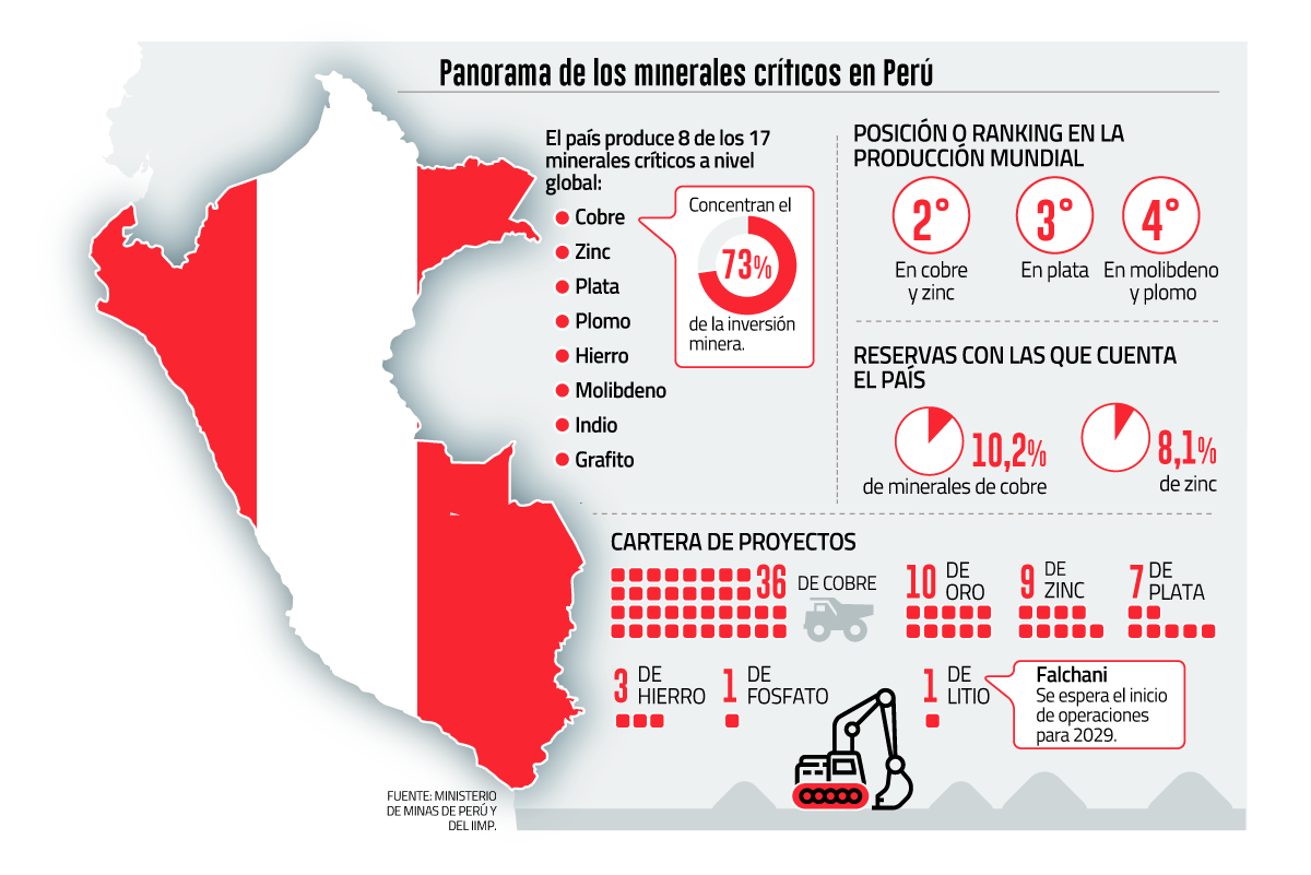 Allí entra Perú: “Nuestro país produce ocho de los 17 minerales críticos identificados en el mundo, y podría llegar rápidamente a 11”, dijo el gerente general del Instituto de Ingenieros de Minas del Perú (IIMP), Gustavo De Vinatea, a este medio.