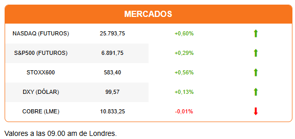 La proximidad de la reapertura del gobierno y la idea de que la Fed recortará tasas el próximo mes, debido a las señales de deterioro del mercado laboral, dan impulso a los mercados. Los futuros de Wall Street se alinean con alzas, con el Nasdaq liderando los avances. El Stoxx600 marca un récord, en una sesión de positivos resultados de empresas. El Ibex español y el Dax alemán dan el mayor impulso con avances de 1%. En Asia, la jornada vio un repunte de las acciones tecnológicas. El dólar marca un nuevo avance. El oro defiende su repunte y el cobre opera plano. El bitcoin vuelve a superar los US$ 104.000 tras un alza de 1,45%.