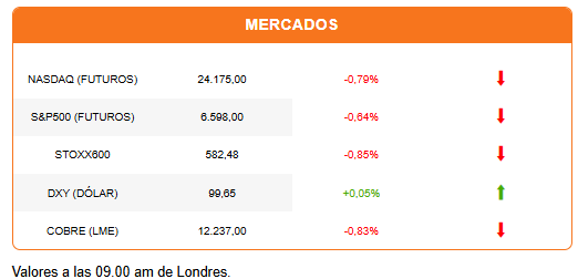 Las acciones tecnológicas también captan parte de la atención del mercado. La holandesa ASML, parte de la cadena de suministro para la fabricación de semiconductores, es una de las firmas más castigadas en la sesión europea. Sus acciones caen 3,45%. Las acciones de Nvidia y AMD pierden más de 1,5% antes de la apertura. Es una reacción del mercado al avance reportado por Alphabet para poder reducir la capacidad de chips y memorias para el desarrollo de modelos de IA.