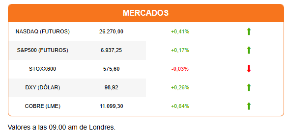 El avance de Nvidia impulsa al Nasdaq. Los futuros del índice lideran entre las acciones estadounidenses, mientras que el Dow Jones prepara una apertura en rojo (-0,25%). Las acciones europeas también recortan los avances iniciales impulsados por los positivos resultados de grandes bancos.