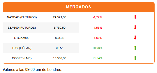 En Asia, el índice regional perdió 2%, y el Stoxx600 europeo retrocede 1,81%. La alta exposición de la bolsa británica firmas de energía y mineras le ayuda a navegar la sesión con una caída menor (-1%). Los futuros de Wall Street caen más de 1,5%, con el Nasdaq liderando las pérdidas.