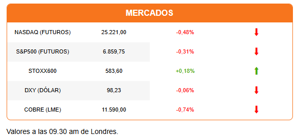 En un escenario de “buenas noticias son malas noticias”, los índices europeos son presionados por las caídas de las acciones de defensa, como Rheinmetall (-4,24%) o Leonardo (-4,54%), ante lo que parece ser la entrada en la recta final hacia un acuerdo para poner fin a la guerra en Ucrania. El presidente estadounidense, Donald Trump, dijo que el “fin está más cerca que nunca” y otros actores reportan avances significativos en las negociaciones. El avance habría sido posible después de que EEUU comprometiera garantías de seguridad a Ucrania.