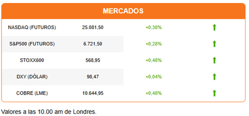 En los mercados, la semana comienza con señales de un acercamiento entre EEUU y China. Los futuros de Wall Street preparan una apertura al alza, alineados con sus pares europeos, tras una positiva sesión en Asia. El dólar opera plano. Mientras, el oro y la plata extienden el rally. El oro sube 1,42% para transar en US$ 4.273 por onza. La plata sube otro 1,75% para acercarse a los US$ 51. El cobre también sube, aunque de forma más moderada. El metal sube 0,63% y se ubica en US$ 10.661 por tonelada en Londres y en US$ 5 por libra en el Comex.