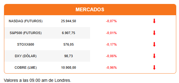 El mercado no reacciona tanto al anuncio, más concentrado en los próximos resultados de las grandes tecnológicas y en los movimientos de la Fed y de otros bancos centrales. Los futuros de Wall Street operan mixtos, aunque han recortado las caídas desde la apertura europea. El Stoxx600 opera con una caída moderada, tras lo que fue una sesión de pérdidas algo mayores en Asia. El dólar opera plano y vemos caídas bastante generalizadas en los commodities.