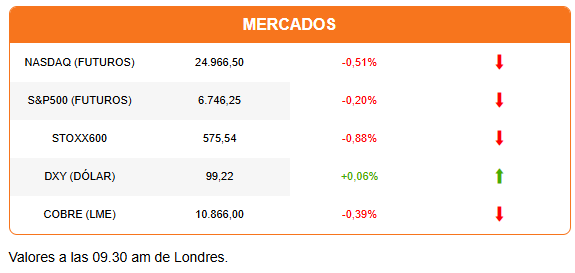 Los futuros de Wall Street se alinean para una apertura de pérdidas, con el Nasdaq liderando las caídas. Las acciones tecnológicas, con sus altas valorizaciones, son sin duda el sector más castigado, además por el temor de que las grandes empresas del sector no logren traducir en crecimiento de utilidades sus multimillonarias inversiones en IA.