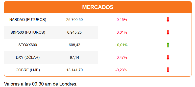 Por el contrario, los metales tienen un nuevo rally. El oro sube 2% para transar en US$5.080 por onza. El platino avanza 3,74%, mientras la plata salta 8% para encaminarse a los US$110. El cobre opera mixto. El metal cae ligeramente en Londres después de un rally previo, que lo ubica por encima de los US$13.100 por tonelada. El cobre sube en el Comex para operar cerca de los US$6 por libra.