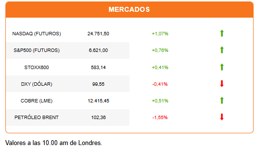 Las declaraciones llevaron a un fuerte repunte de Wall Street, que se extiende hoy a Asia y la apertura europea. Los bonos repuntan. El dólar (DXY) cae 0,47% y el petróleo pierde más de 2%. El barril de crudo Brent, sin embargo, ha recortado recientemente su caída. Tras ubicarse temporalmente por debajo de US$100, opera ahora en US$101.