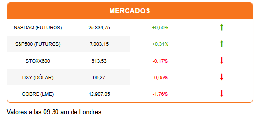 Los futuros del Nasdaq lideran los avances, pero el S&P500 y el Dow Jones también se alinean para una apertura al alza. Los índices estadounidenses se desacoplan así de las caídas en Europa y la sesión mixta en Asia. En esa región, la debilidad del Nikkei y la caída de las acciones chinas (por nuevas regulaciones de capital) frenaron los avances.