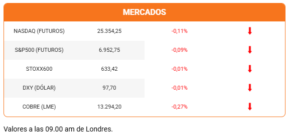 Sin embargo, el Nasdaq no logra evitar operar en rojo antes del inicio de la sesión. Se alinea así a las bajas moderadas del S&P500 y el Dow Jones. En Europa, la sesión es mixta, siguiendo la pauta de Asia. El dólar opera con una ligera tendencia a la baja, y vemos caídas en los metales. La plata sufre el mayor ajuste, con una baja de 4,30%. El cobre retrocede, pero mantiene los US$6 por libra en el Comex.