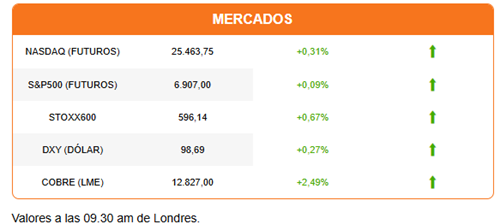 También se percibe una búsqueda de refugio por parte de los inversionistas en los metales. La plata salta 6,45%, el platino un 4,16%, y el oro un 2,61%. El cobre avanza 3% en el Comex para marcar los US$5,86 por libra, y un 2,45% en Londres, donde supera los US$12.800 por tonelada.