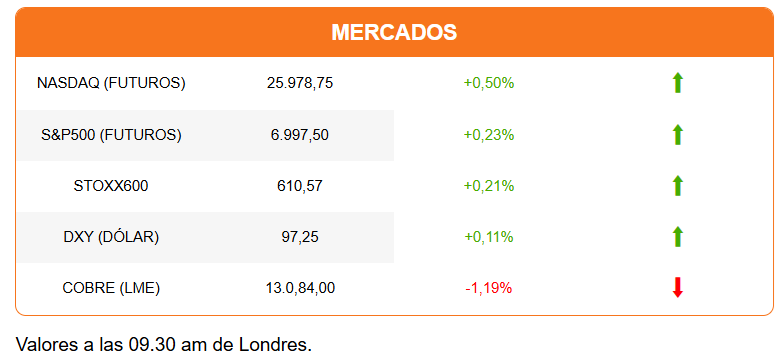 Es una jornada de caídas en los commodities, aunque el oro (US$5.120) y la plata (US$112) se mantienen en niveles récord. El cobre cae 2% y opera en torno a los U$5,90 por libra en el Comex.