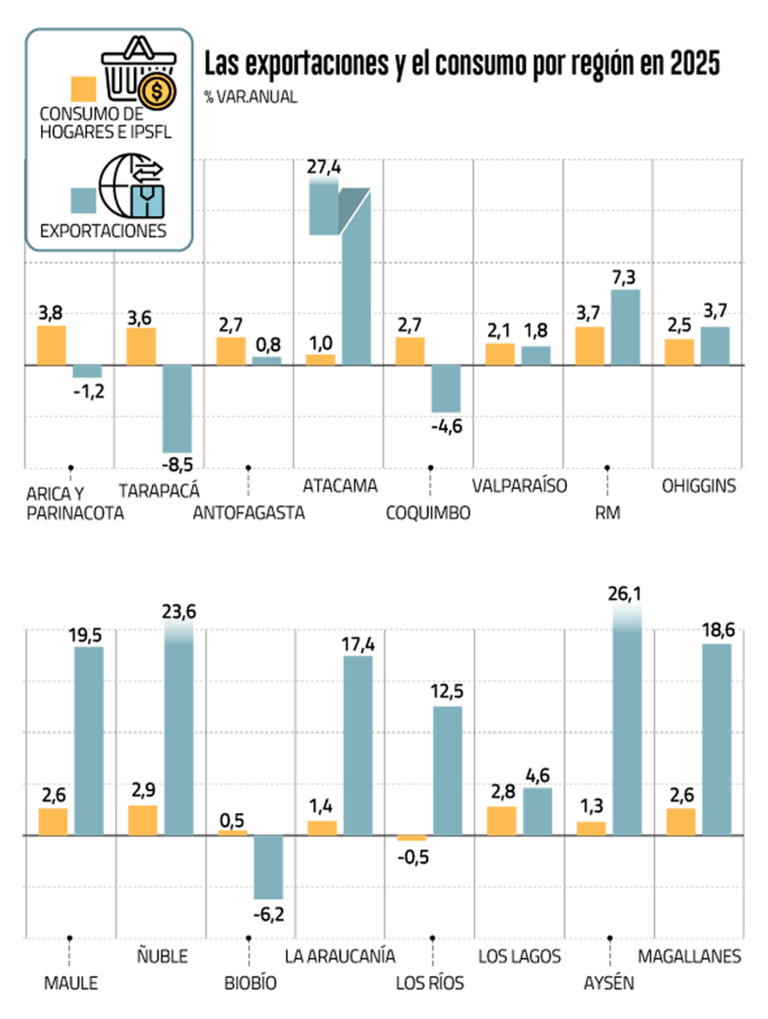 Se trata de un nivel superior al 2,5% que observó el país en su conjunto en cual dio cuenta en el alza en la actividad de 14 de las 16 regiones del país. Además, en 15 se registró un aumento en el consumo de los hogares, logrando 2,7% a nivel nacional, mientras que las exportaciones se incrementaron en 12 y registraron una variación de 4,6%.