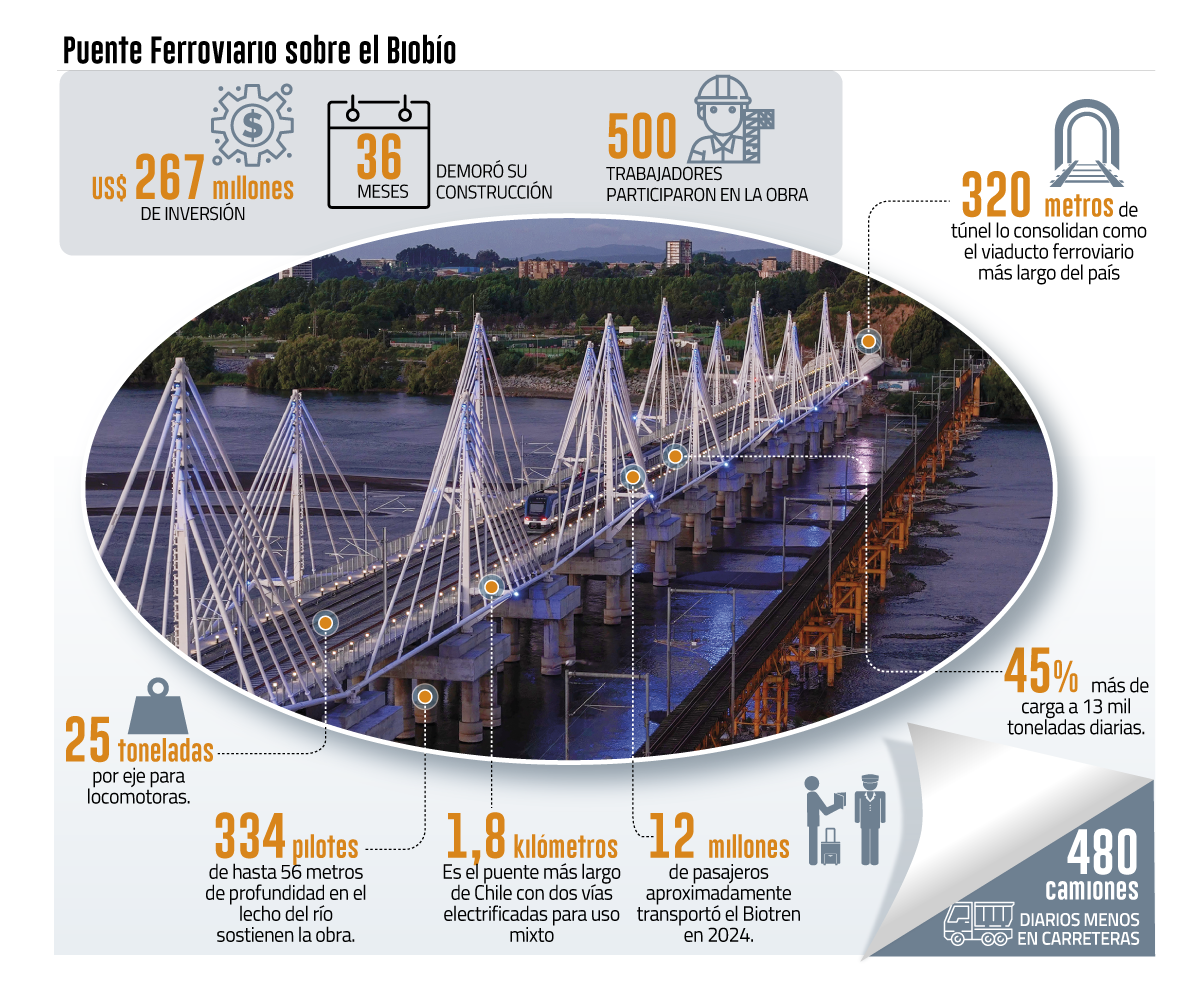La obra, construida por la empresa española Sacyr, está diseñada para resistir las crecidas históricas del río Biobío y sismos de gran magnitud, como el ocurrido en 2010. Con un túnel de 320 metros y doble vía electrificada, se consolida como el viaducto ferroviario más largo del país y una pieza clave en la integración del sistema de transporte público del Gran Concepción.