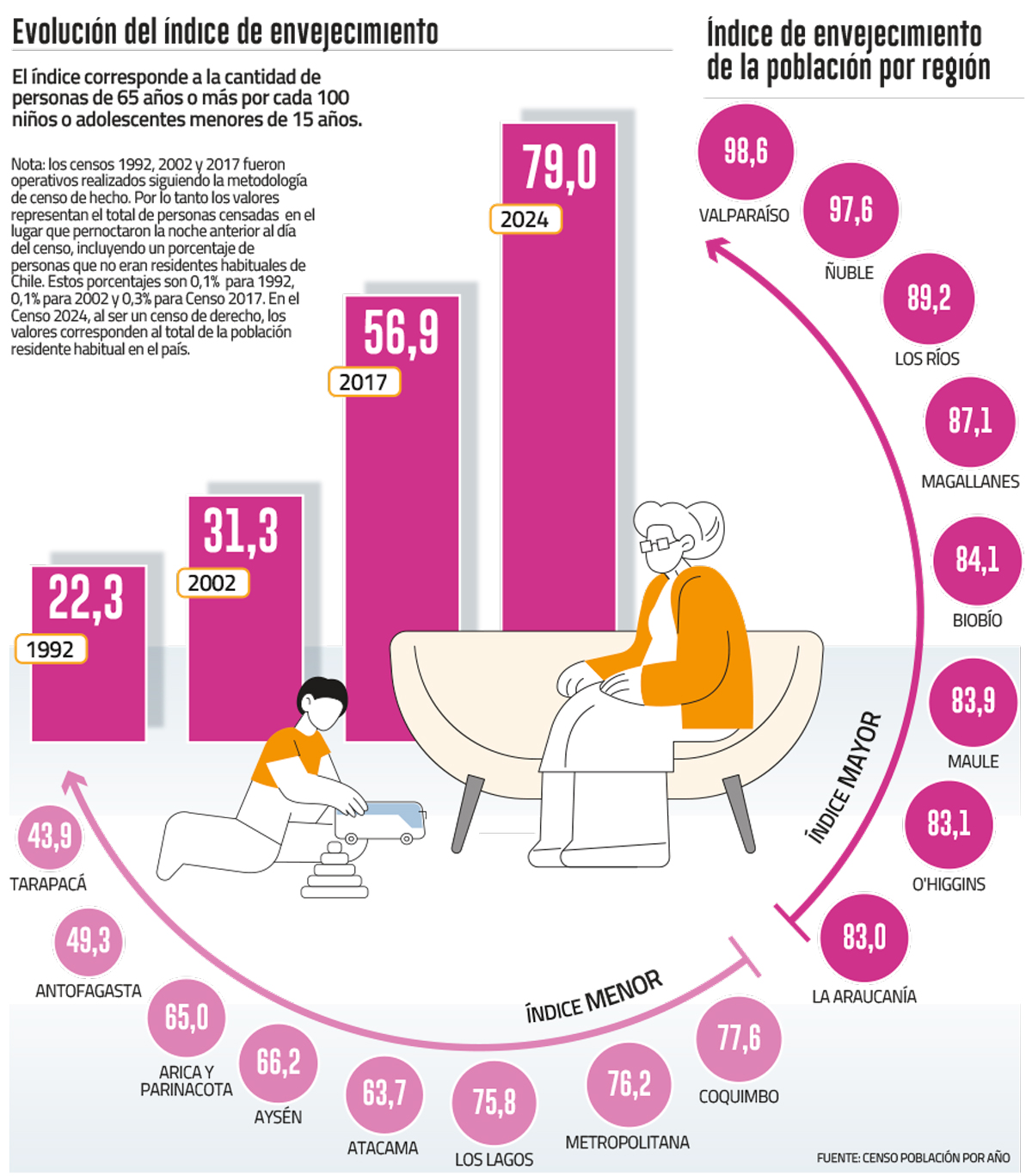 Chile envejece rápido: el índice que medía 22 adultos mayores por cada 100 niños en 1992 llegó a 79 en 2024.