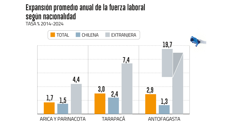 La excepción en este caso es lo ocurrido en el norte grande, donde el avance de la fuerza laboral se aceleró por la migración de extranjeros, lo que ha traído aparejado un cambio en la creación de empleo.