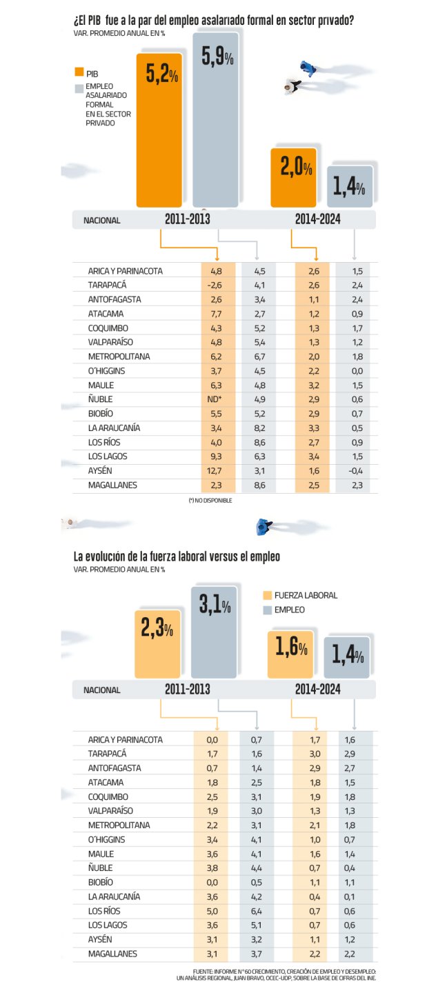 Bravo advirtió que el crecimiento promedio anual de la zona se redujo en la reciente década, lo que a su vez se tradujo en una pérdida de dinamismo en la generación de empleo formal privado, que pasó de subir 3,1% promedio anual en el período 2011-2013 a caer 0,4% promedio anual en el lapso 2014-2024.