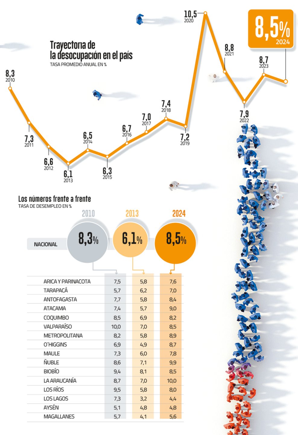 Un primer punto, tal cual lo constató el análisis realizado por el director del Observatorio del Contexto Económico de la Universidad Diego Portales (OCEC-UDP), Juan Bravo, a los datos de los últimos 15 años del Instituto Nacional de Estadísticas (INE), es que la baja del desempleo vista entre 2010 y 2013 hasta los bordes de 6% dio paso a sostenidos aumentos que se aceleraron con la crisis sanitaria.