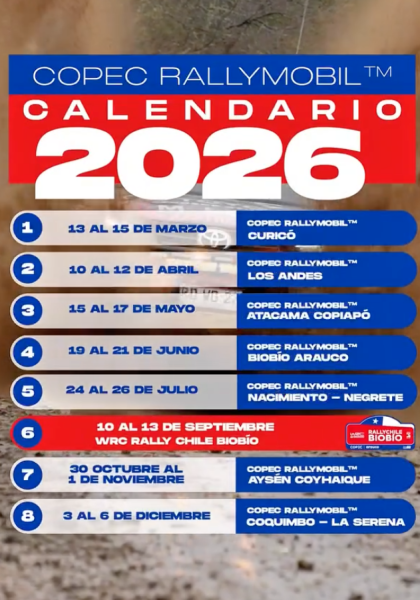El calendario 2026 se extenderá hasta diciembre y considera competencias en seis regiones, con un marcado énfasis en el centro y sur del país. Tras la fecha inaugural en Curicó, el campeonato continuará en abril con una segunda jornada en el sur, mientras que los meses siguientes incluirán paradas en regiones como Biobío, La Araucanía y Los Lagos, zonas históricamente ligadas al rally nacional.